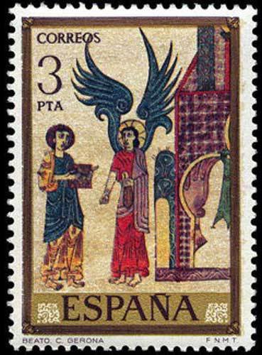 Sello de 4 ptas. correspondiente al la colección «Homenaje al pintor desconocido». En 1967, Correos dedicó la emisión de rendir homenaje a los artistas anónimos de la Prehistoria que realizaron las pinturas rupestres en distintas cuevas españolas.